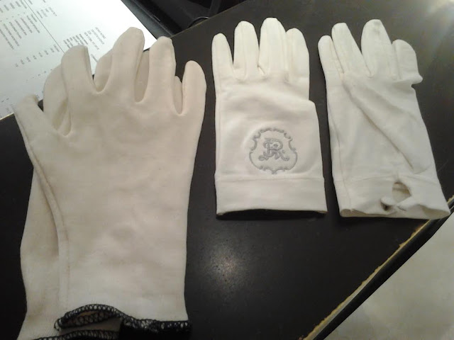 Speaking of waiters, this company provides items to the St. Regis Hotel. Below are the gloves used by the hotel staff. Notice the appropriate size, the monogram and the button. They are well-made, with attention to detail. True "first class". On the left is this company's gloves: cheap-looking, one-size-fits-all. "Wannabe like first class". Another telltale sign of uncaring "cutting corners".