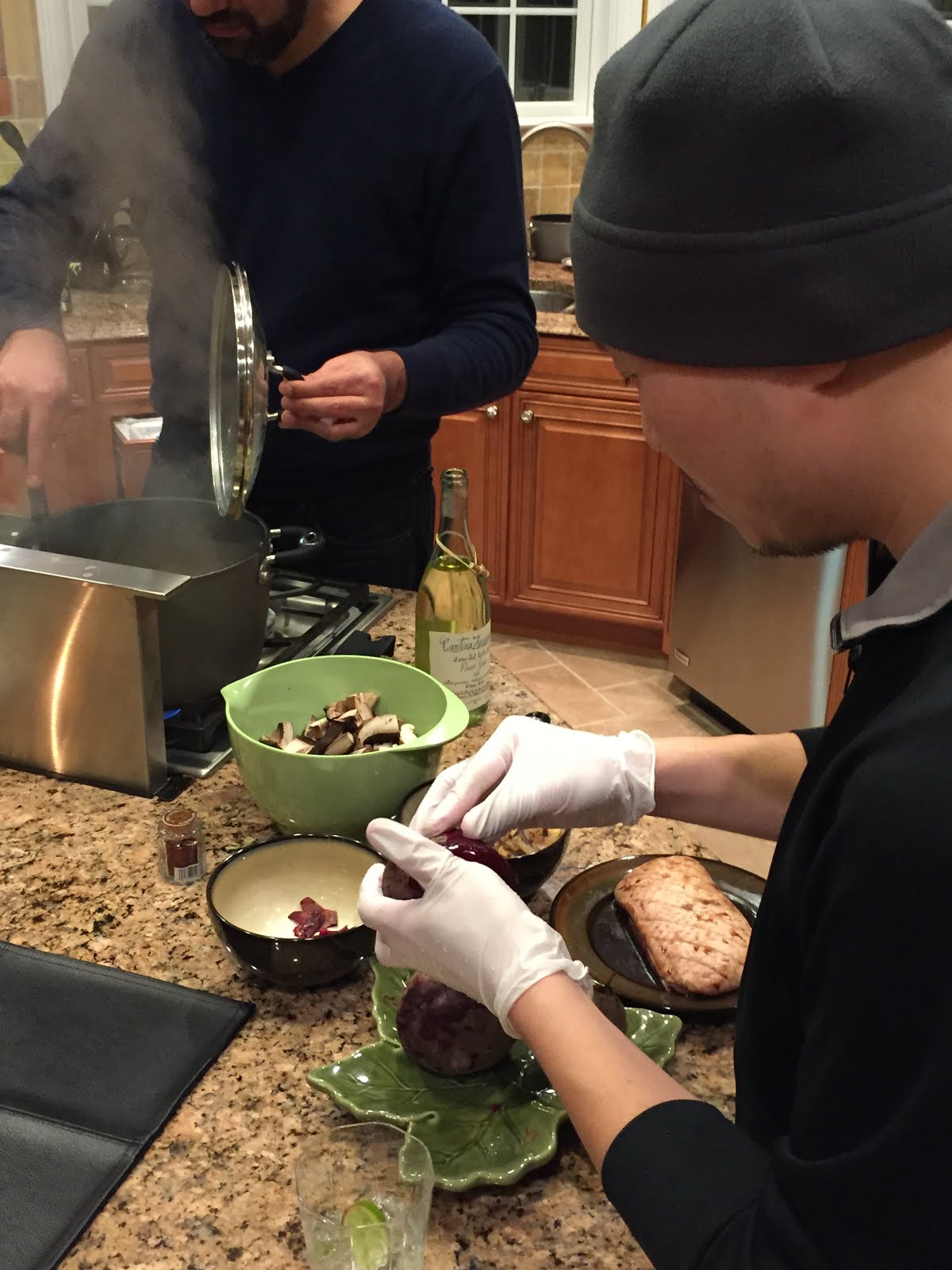 Everyone participated in dinner prep. Lewis de-veined shrimp, while Lee sautéed mushrooms. I rinsed/boiled fresh beets for our salad. Rice soaked in broth, and we sliced the sausage.