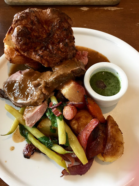 The terrace was full, so we happily sat indoors. We shared freshly-baked cinnamon scones with clotted cream and homemade jam. Lewis had a succulent chicken "meat pie". I ordered their Sunday Roast: juicy lamb with vegetables from their garden, and roasted potatoes cooked in goose fat. Even though it is an out-of-the-way place, its menus are printed in Dutch and English.
