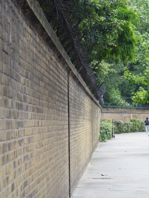 Then, we continued up Constitution Hill, observing the historic WWI-era cast-iron repellents atop the brick wall that encircled Buckingham Palace and its lake, honeybee aviary, and gardens (350 species of British flowers). It looks like this--and seems more forbidding at night.