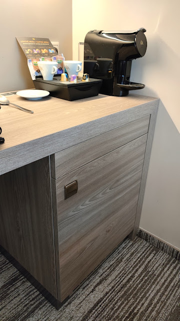 The room was handsomely designed with recessed lighting, the comfiest queen-sized mattress, firm pillows (our preference to the hotel), ample closet space, lots of counters and shelves, a push-button “blackout shade” for the windows, sheer curtains for privacy, drapes for partial dimness, and a mini-fridge that blended into the wall.