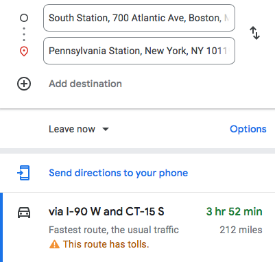 Despite its huge size, America remains backwards and resists investing in high-speed trains. However, its unbelievably inferior (and filthy) trains cost more than Italy's high-speed First Class tickets! Here is an example: traveling from NYC to Boston is 200+ miles, yet trains moves as slow as cars. You don't save any time on trains. In fact, the 4.5-hour train ride takes LONGER than driving (but driving is penalized by tolls and traffic jams on America's clogged highways). Here is the calculated car journey (click the image to make it clearer)...