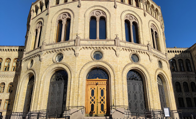 We attended a free tour (in English) of the Parliament Building. Seen below, we merely had to cross the greenery of Eidsvolls Plass to get there.